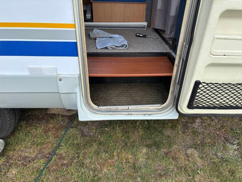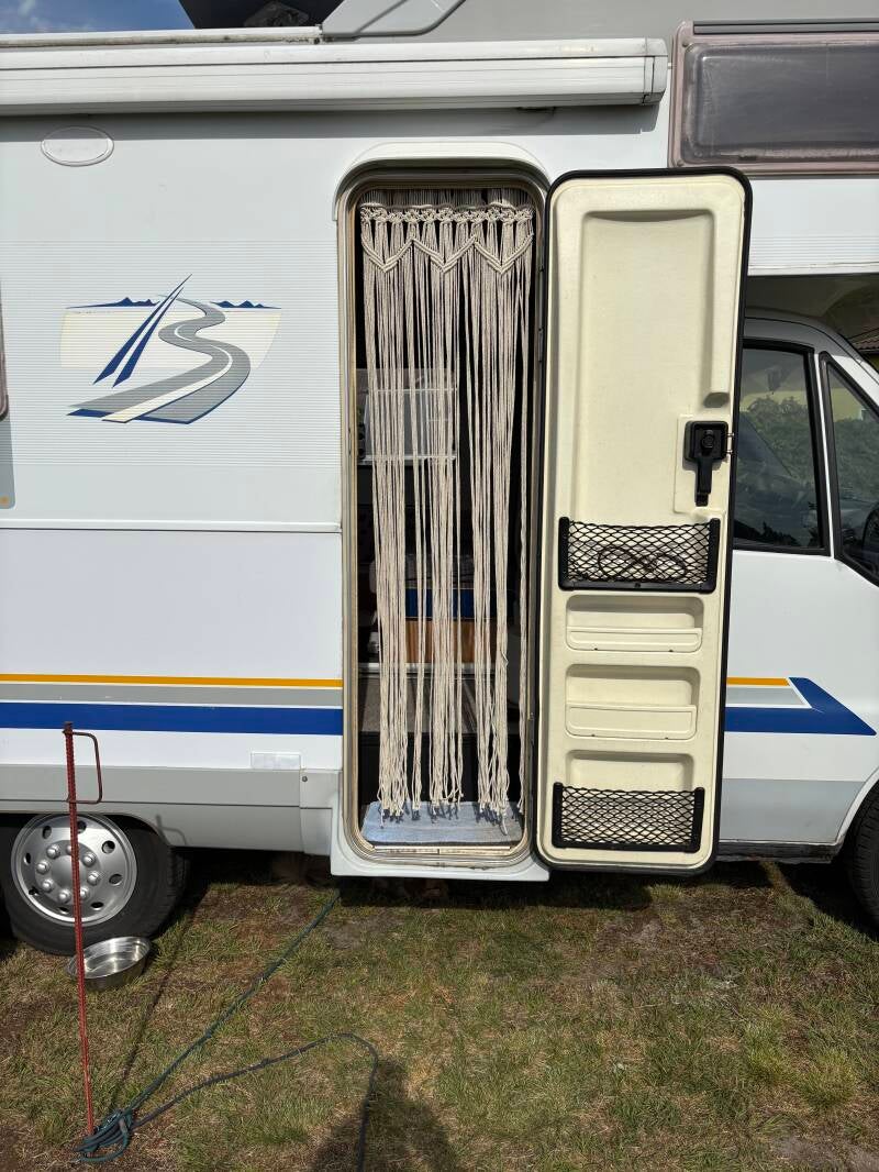 ein Fliegenvorhang in Makramee schütz vor neugierigen blicken. Ein zusätzliche Boden an der Eingangsstufe wurde noch für die Hunde gefertigt, das Hundegitter hindert die Hunde dann am rausspringen.
